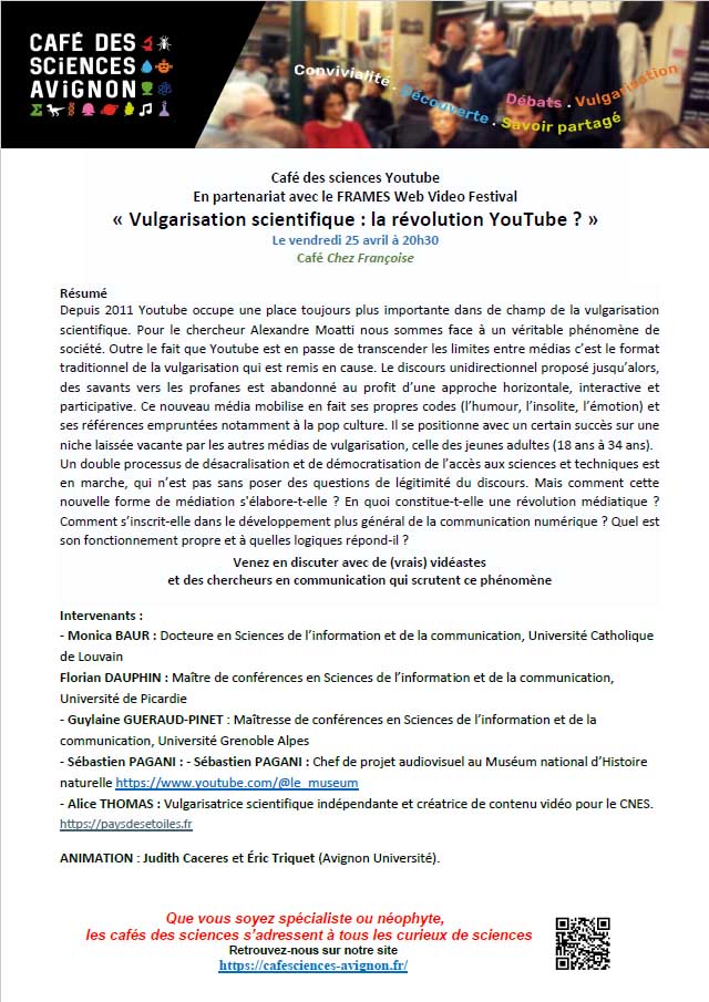 - Debove, S., Füchslin, T., Louis, T. et Masselot, P. (2021). French Science Communication on YouTube: a survey of individual and institutional communicators and their channel characteristics. Frontiers in Communication, 6.