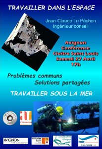 Cette conférence de Jean-Claude Le Péchon « La Plongée et l’Espace » est proposée par le Café des Sciences d’Avignon, l’Université d’Avignon et le Comité Départemental de Plongée du Vaucluse.